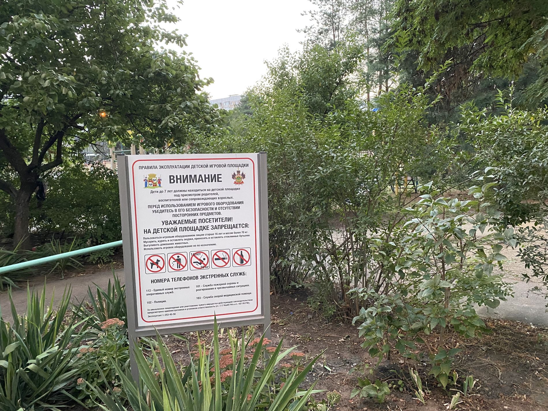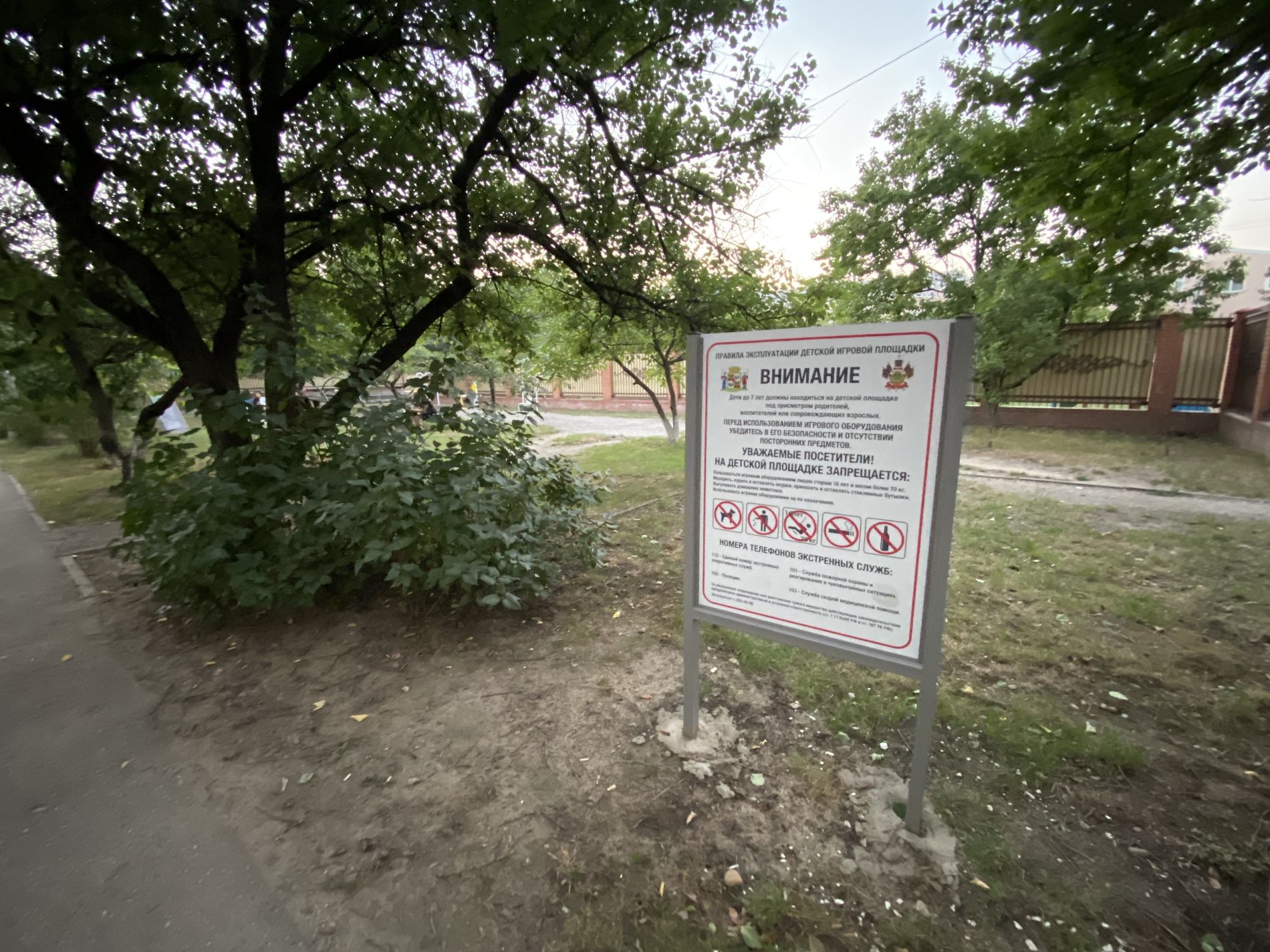 «Уважаемые посетители! На детской площадке запрещается: пользоваться игровым оборудованием лицам старше 16 лет и весом более 70 кг, мусорить, курить и оставлять окурки, приносить и оставлять стеклянные бутылки, выгуливать домашних животных, использовать игровое оборудование не по назначению», — указано на одной из табличек, за которой не наблюдается никакого оборудования.