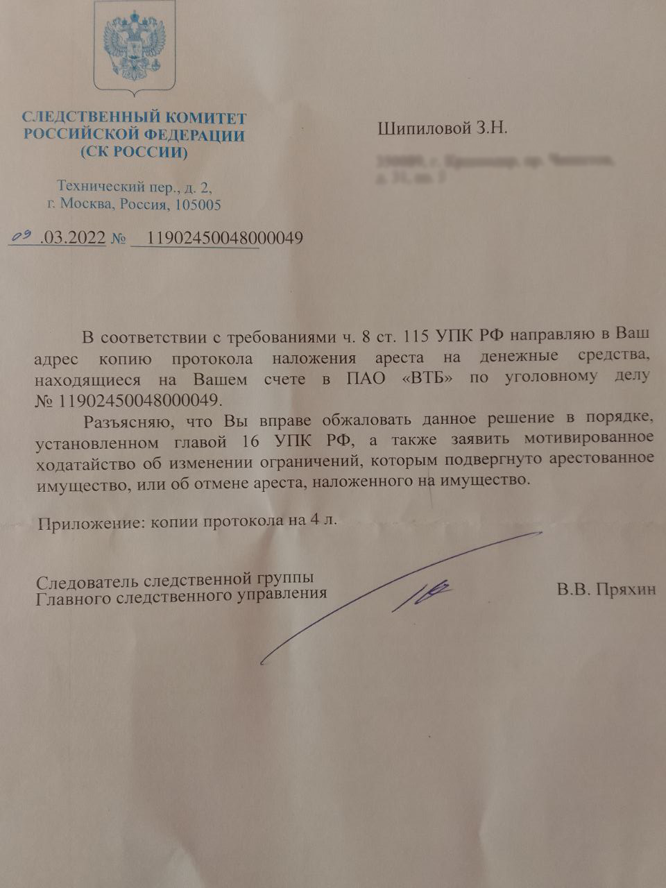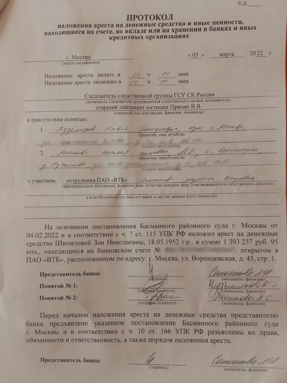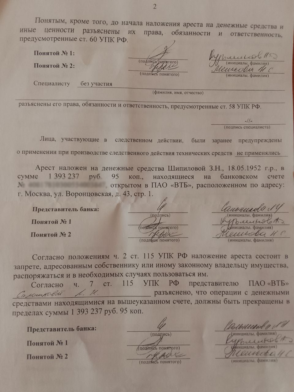 Корреспонденту «Протокола» Яна Антонова рассказала о том, что копию протокола о наложении ареста прислали по почте. Мать экс-координатора «Открытой России» неоднократно пыталась забрать свои деньги, однако банк этому препятствовал, несмотря на отсутствие законных оснований для отказа в выдаче средств.